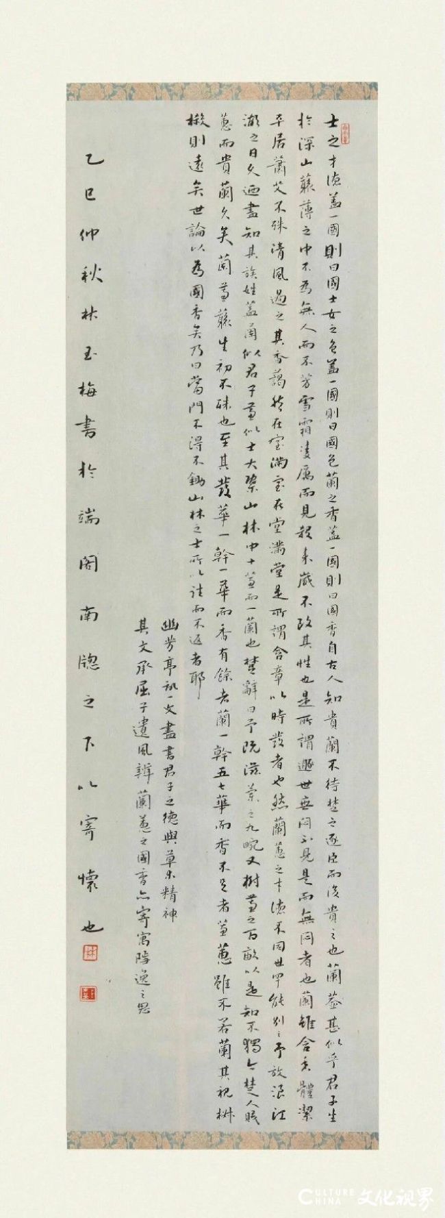 若说楷书是“立”,则行书即是“行”,是动静之间的牢固流转。孙过庭在《书谱》中言:“行也者,介于真草之间,兼真之稳、草之活,非真非草,离方遁圆。”林玉梅的行书,正是得此精髓,以“气”为脉,以“韵”为魂,将文字的灵动与章法的调解推崇得长篇大论。其行书最显妙处,在于“行气”的意会——字与字之间,或牵丝映带,如滞滞泥泥;或笔断意连,如远山含黛。一转之中,笔画疏密相间,墨色枯湿浓淡轮流,如洋洋纚纚,当然天成。不雅其长篇行书,便如读一首平仄调解的古诗,承前启后间自有节拍,时而疏忽如踱步春园,时而仓猝如惊鸿掠影,时而舒服如钟鼎沉渊,时而细小如蝶舞花间。