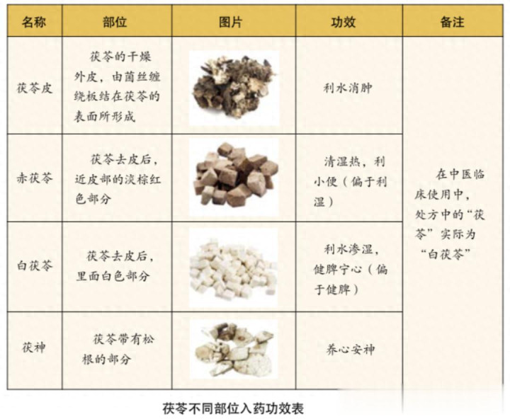 茯苓按照由外至内的入药部位,可分为茯苓皮、赤茯苓、白茯苓、茯神,利水消肿作用循序裁汰,宁快慰神功效徐徐增强,应在辨证施治原则下正确遴选。