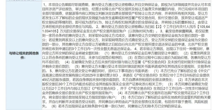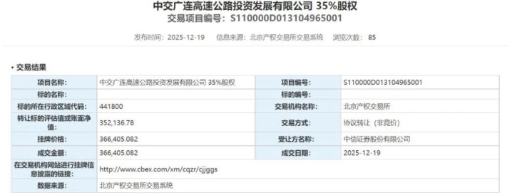 据北京产权来往所环球信息,中交广连高速公路投资发展有限公司35%股权已于2025年12月19日成交,成交金额36.64亿元,受让方中信证券。