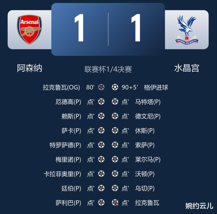 关于阿森纳而言,晋级四强后的敌手是切尔西,两队上一次交战亦然平局终了。这场杯赛的比赛中,阿森纳的问题很显明,其中热苏斯屡次错失得分契机也突显了球队在要道位置的闭幕短板,更恶运的事在拉克鲁瓦乌龙提升之后,阿森纳并未乘胜逐北扩大上风,反而在顾惜端出现松懈,最终被水晶宫收拢定位球契机绝平。